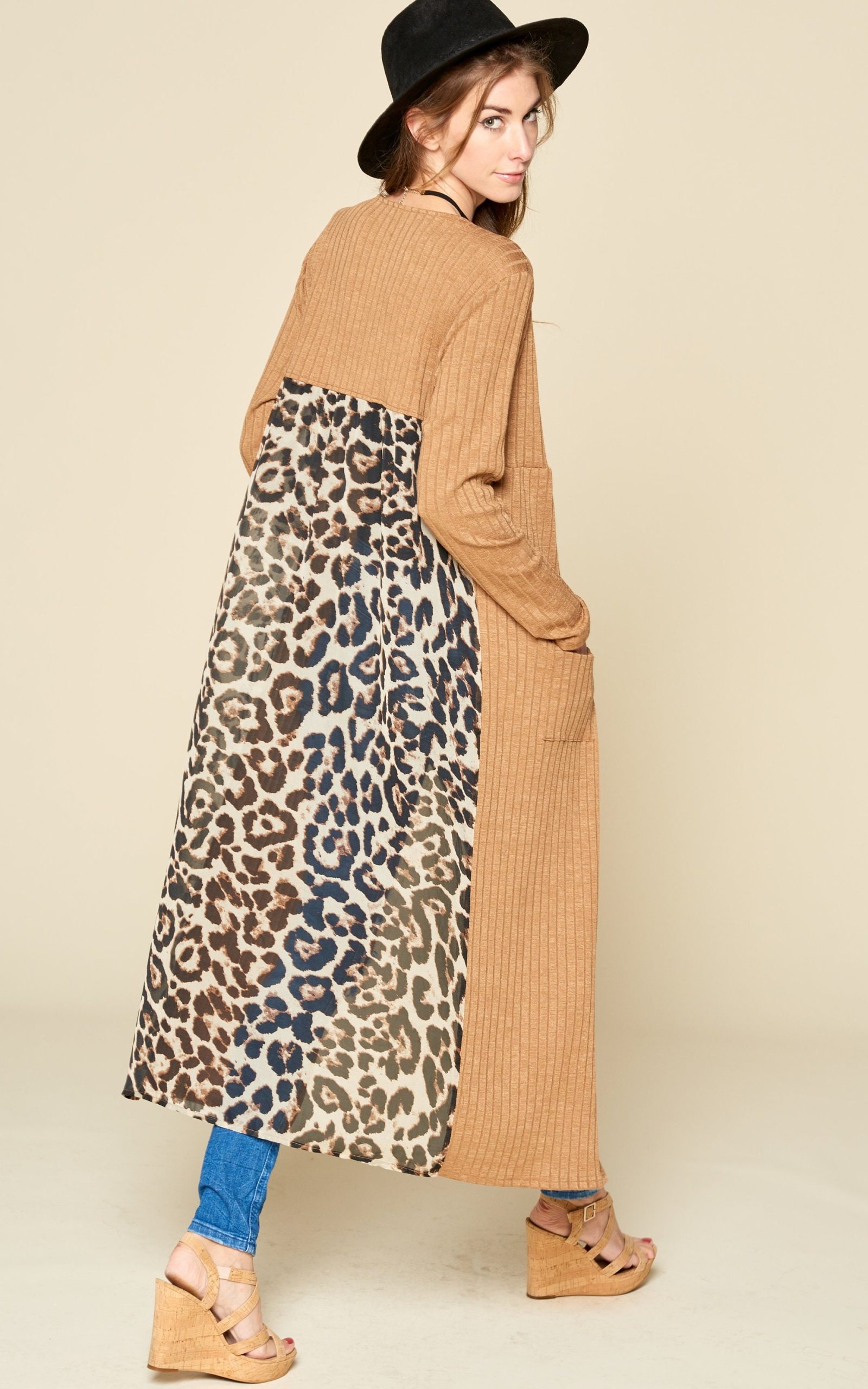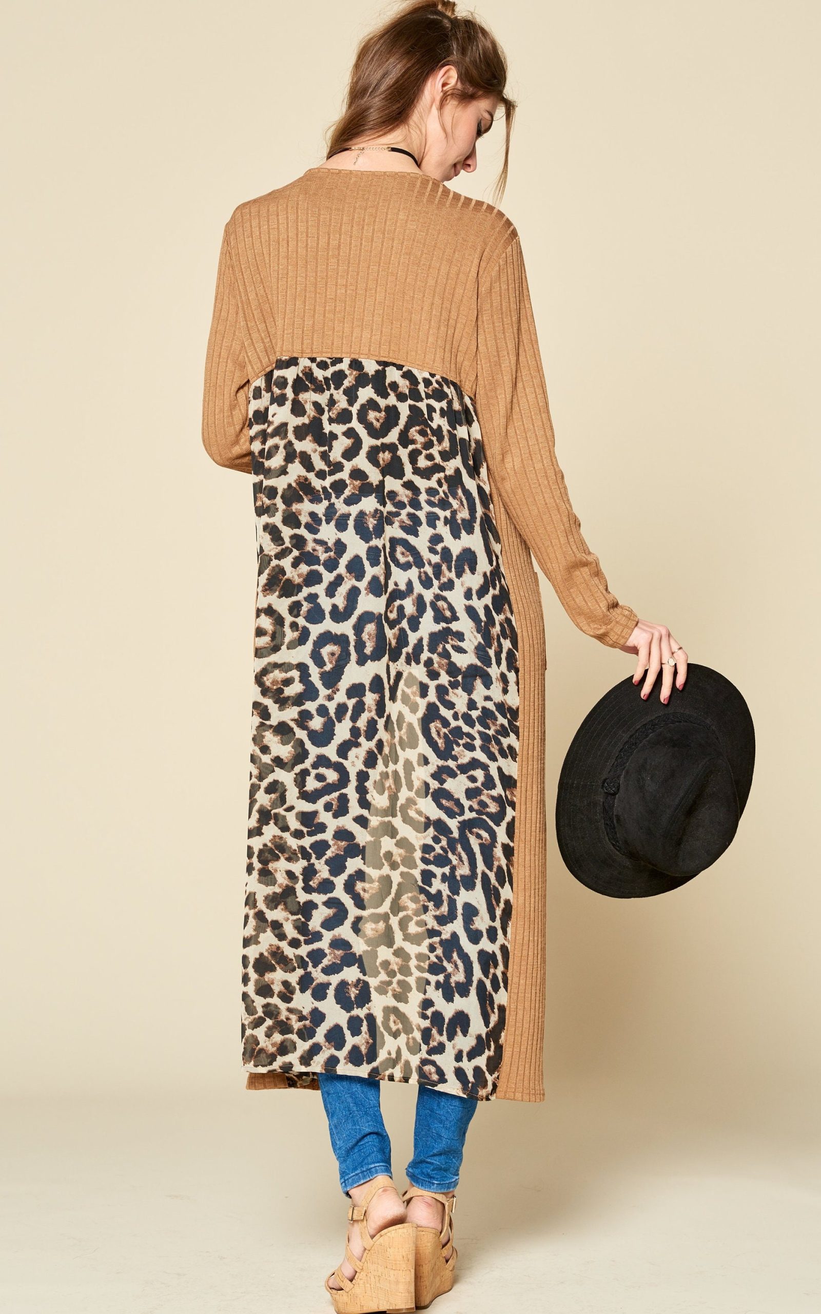 Open front, long sleeved maxi cardigan with back leopard chiffon contrast.