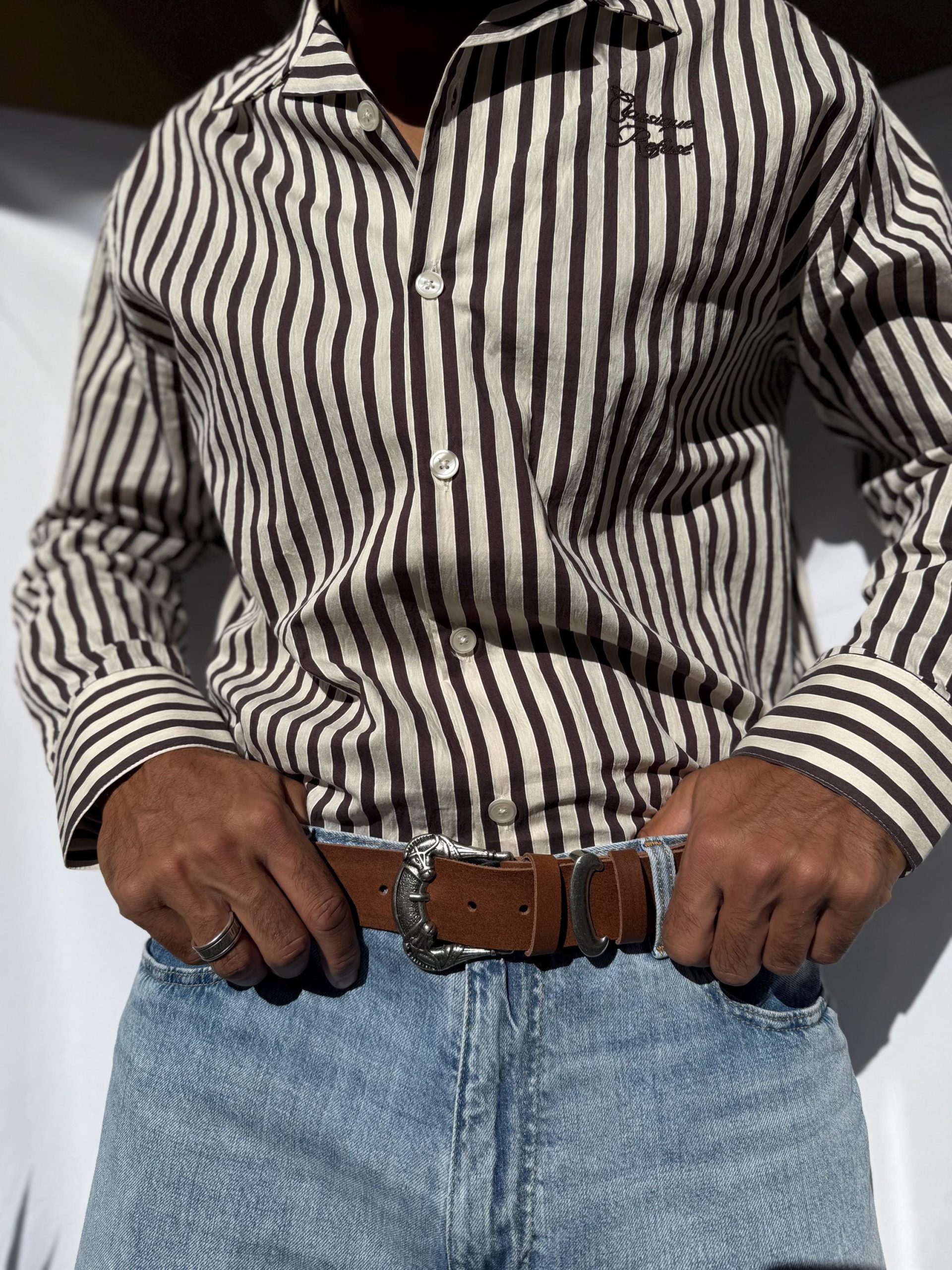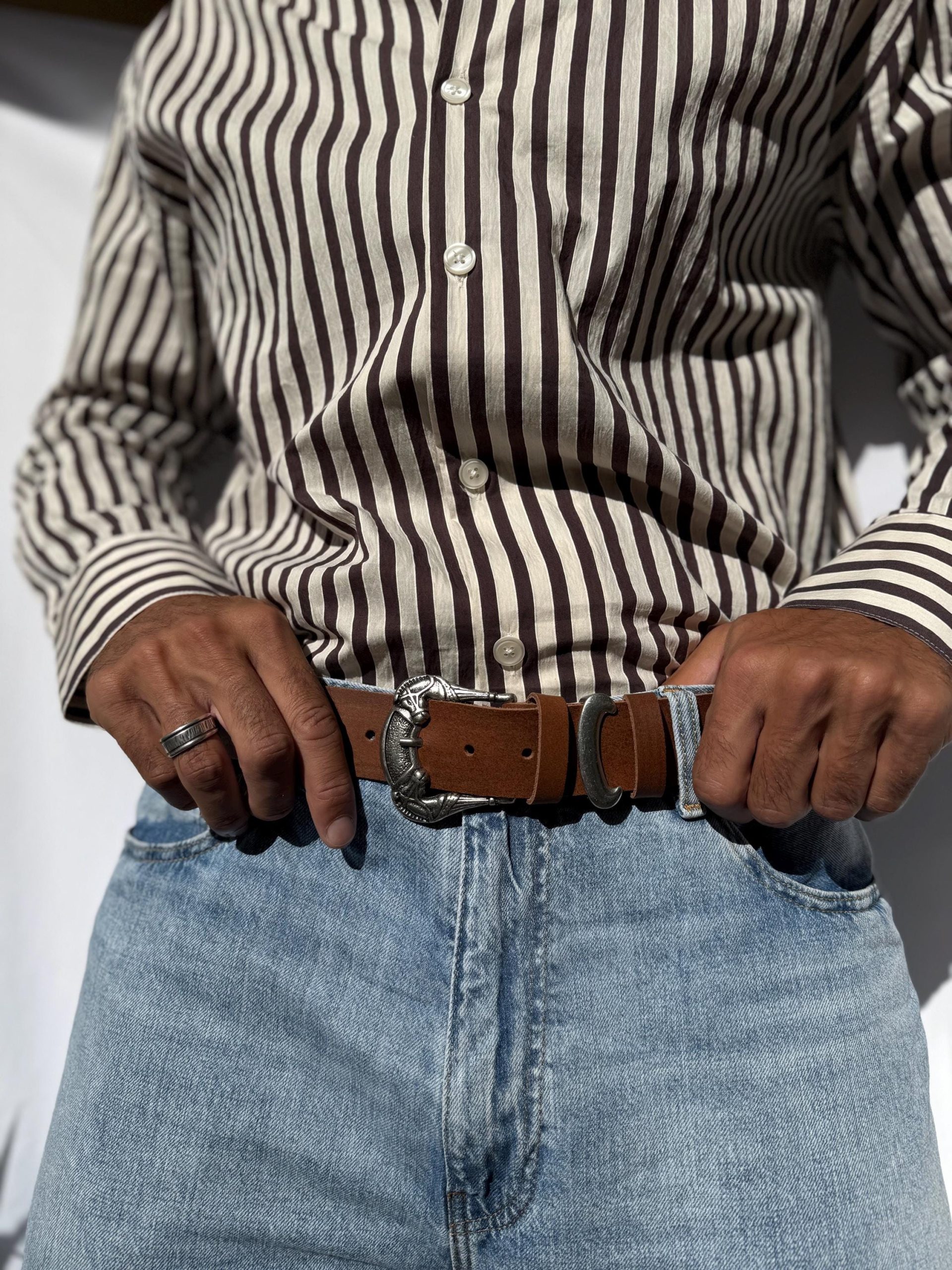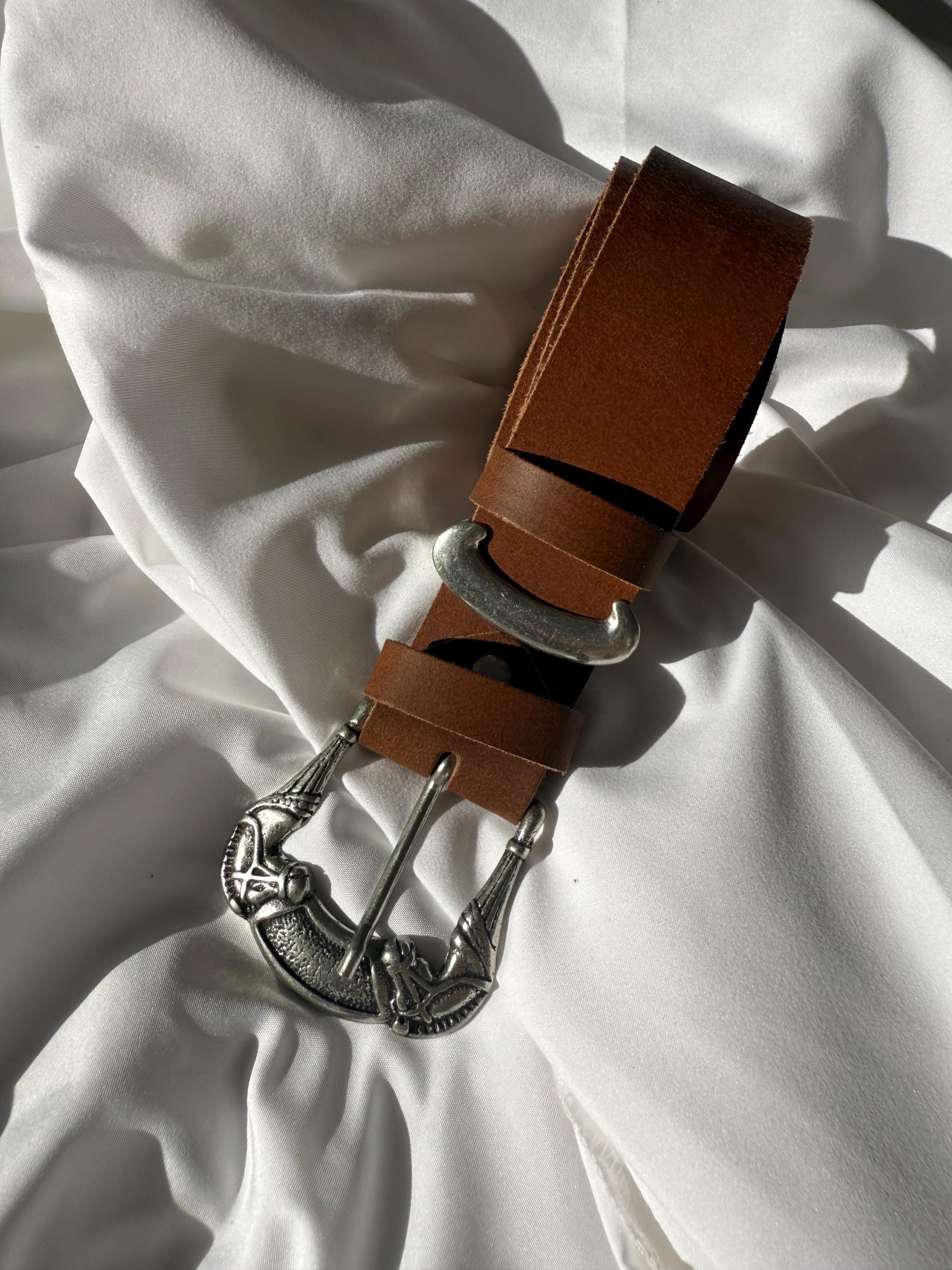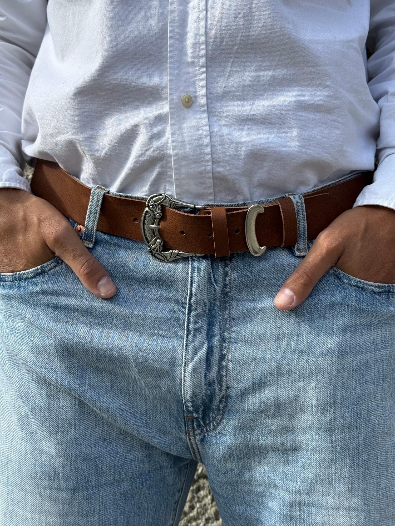 This handmade men s belt is crafted from waxed brown leather and features an eye-catching western-style silver buckle. Durable, timeless, and masculine, it s perfect for jeans or casual outfits. A unique handmade accessory that brings vintage character and refined craftsmanship to every look.
