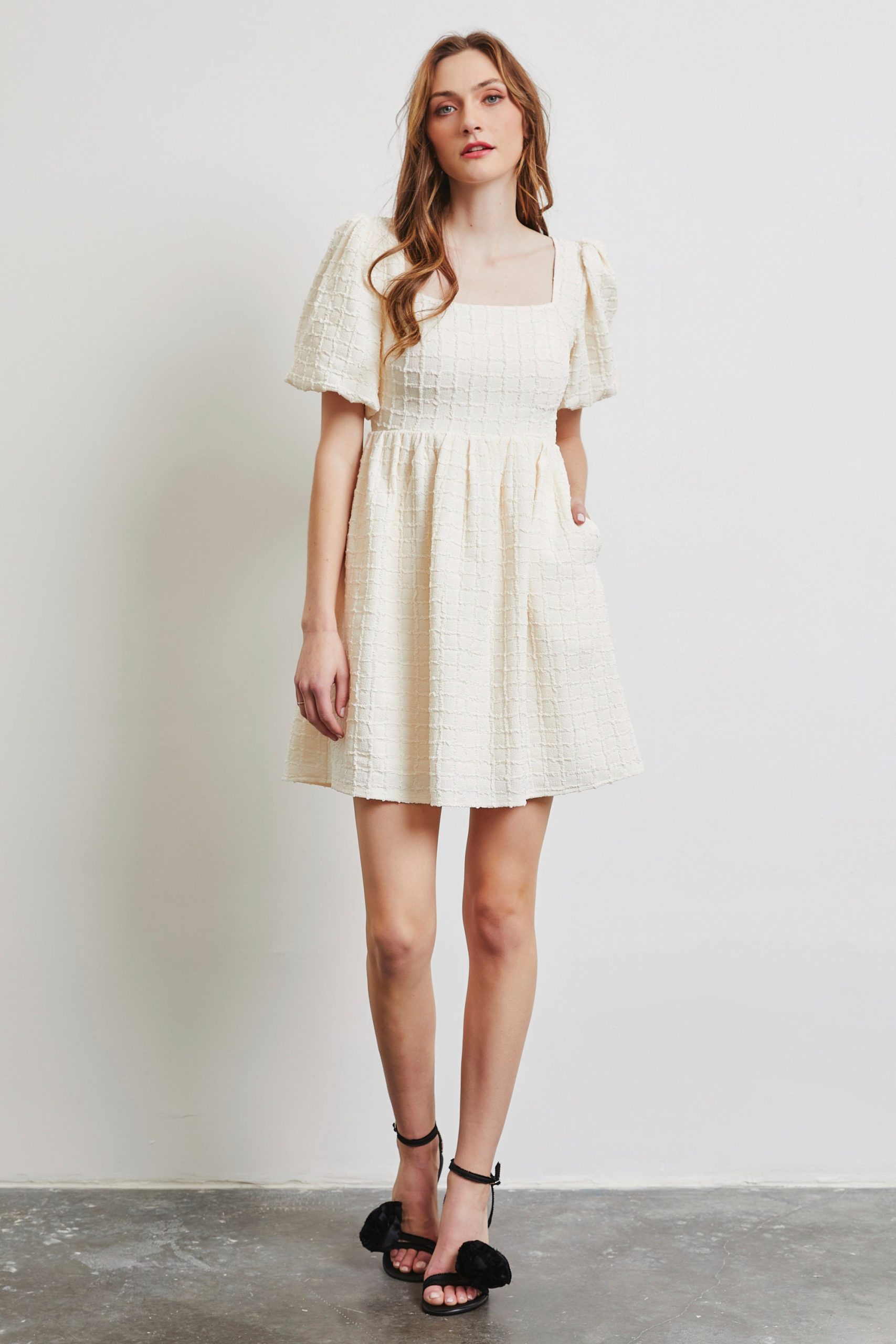 Step into elegance with this romantic and timeless mini dress, crafted in premium textured fabric. Designed with a flattering square neckline, charming bubble sleeves, and a comfortable smocked back, it brings together cuteness and class in the best way.